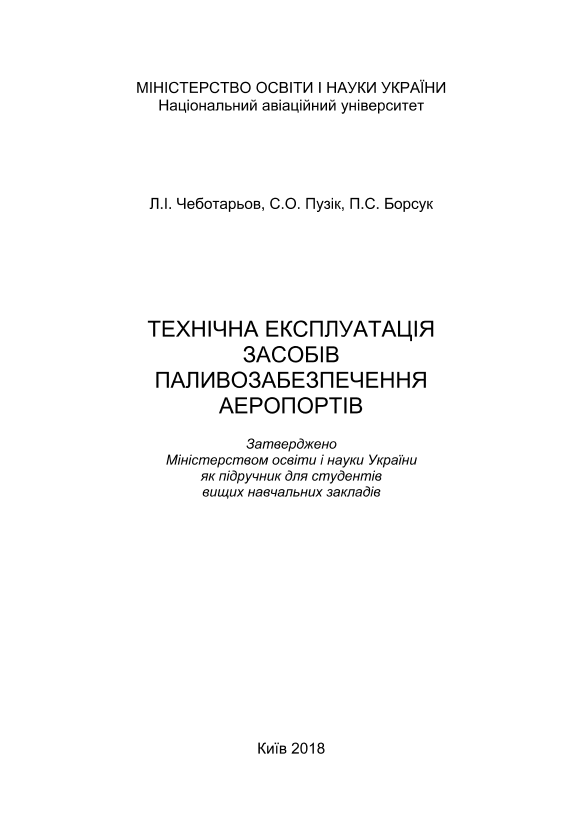 Чеботарьов, Л. І. Технічна експлуатація засобів паливозабезпечення аеропортів [Текст] : підручник / Л. І. Чеботарьов, С. О. Пузік, П. С. Борсук ; МОН України, Національний авіаційний університет. – Київ : НАУ, 2018. – 264 с.